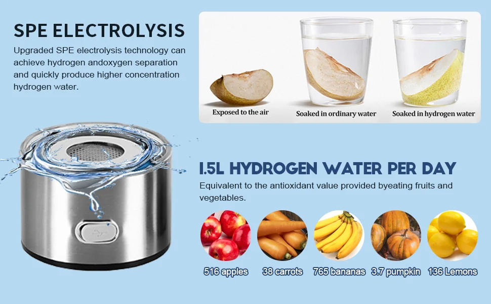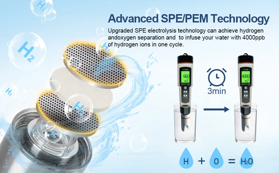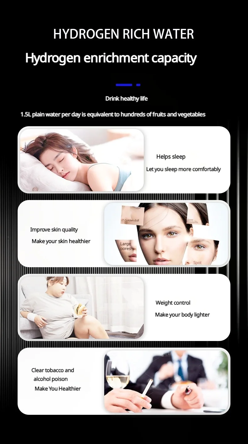 1. Improve water quality in 3 minutes: Using advanced SPE and PEM technology, the water quality is improved by rapid electrolysis in 3 minutes. A single use produces a high concentration of 1600 ppb of hydrogen, transforming ordinary drinking water into alkaline water rich in hydrogen ions. Suitable for all drinking water qualities. Provides you with high quality water.